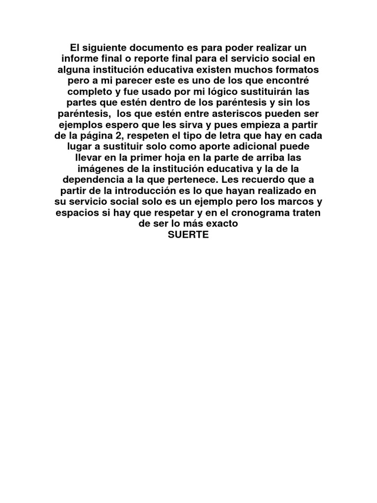 A través del área de servicio social del plantel ponemos a disposición de los alumnos los formatos requeridos para validar su servicio social en tiempo y forma. Entregar un programa de trabajo cuatro 4 reportes de actividades bimestrales un informe final el trabajo de dos hojas y oficio de carta de terminación para tramitar la liberación de servicio social. ü entregar los reportes bimestrales y finales y carta de liberación correspondientes debidamente llenados firmados y sellados por la institución donde se realiza servicio social. 3 recoger en servicio social tu carta de presentación misma que tendrás que entregar en la dependencia donde realizarás tu servicio.