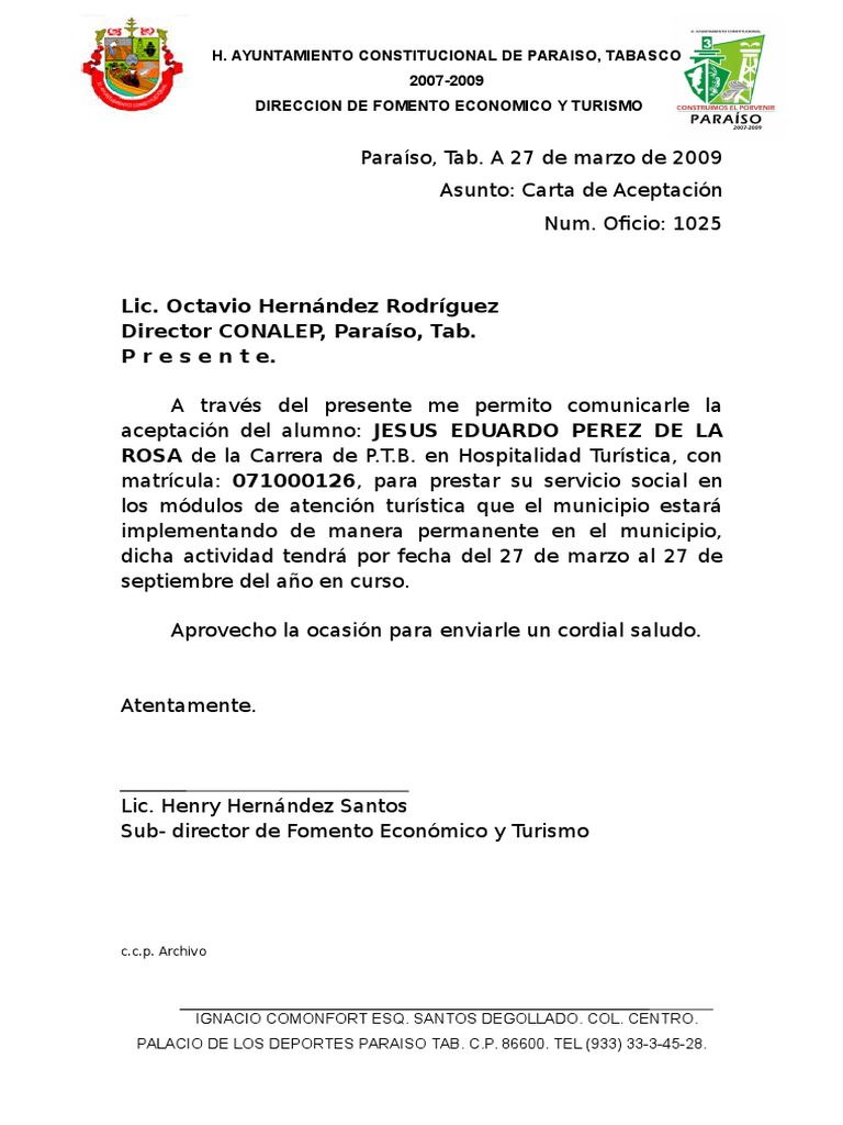 Descargar carta de aceptación de servicio social te podria interesar cómo hacer un currículum vitae. De conformidad con lo establecido en los artículos 52 y 55 de la ley reglamentaria del artículo 5 constitucional el servicio social es de carácter obligatorio y temporal y debe ser realizado por el alumno o egresado en beneficio de la sociedad conforme a programas y proyectos de carácter social desarrollados por instituciones públicas. Carta de aceptación de servicio social. Profesionales carta de aceptación y término del mismo conformidad con las formalidades que precise el conalep de acuerdo con la normatividad aplicable en la materia.