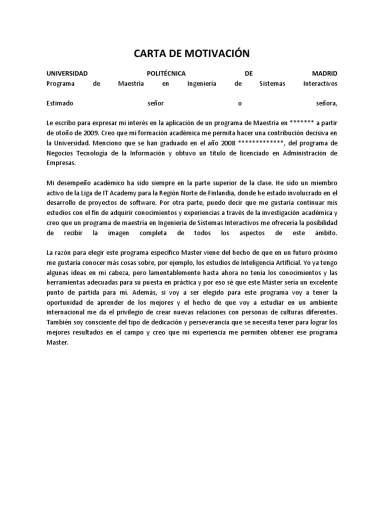 Carta de motivacion master ingenieria. Ya sea para un trabajo beca o máster existe una competencia. Ejemplo de carta de motivación para obtener una plaza de máster departamento español facultad de lenguas modernas universidad x de madrid c prudencio álvaro 17 28027 madrid claudia lópez c pradillo 19 28002 madrid tel. Si te consideras un candidato riguroso vivaz y motivado porque no decirlo. Además asegúrese de escribir la carta de motivación perfecta mediante el avance de sus habilidades del idioma inglés en una escuela de idiomas en el extranjero.
