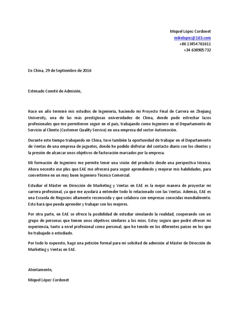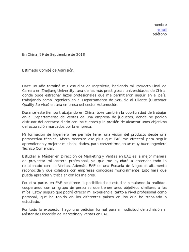Esta carta de muestra también puede servir de inspiración si está considerando una licenciatura en ingeniería biomédica. Realizar una buena carta de presentación para master no solo te permite expresar tu motivación por realizar determinados estudios u ocupar determinado puesto si no que también te ayuda a mostrar más de ti. Ejemplo de carta de motivación para obtener una plaza en una escuela de negocios consejo educativo departamento de mba escuela de negocios c prudencio álvaro 17 28027 madrid claudia lópez c pradillo 19 28002 madrid tel. 4 85 13 votos gracias por votar.
