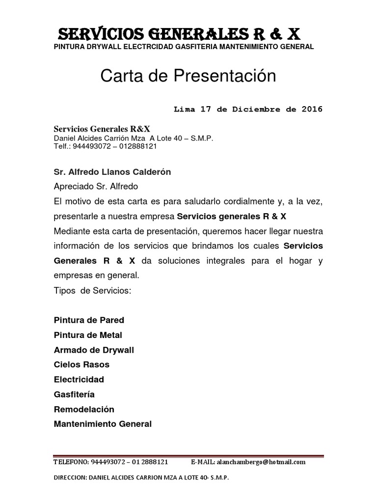 También enfrentaremos a empresas de la competencia y si queremos figurar dentro del mercado. Pintura drywall electrcidad gasfiteria mantenimiento general. La carta de presentación de una empresa es un documento formal que como su nombre lo indica las empresas lo emiten para indicar cuáles son los servicios que tienen disponibles y que así sus posibles clientes conozcan un poco más acerca de ellas muchas veces una compañía las manda como parte de su cv empresarial para que así tenga un toque más profesional en lo que se envía. Las empresas pueden ofrecer dos tipos de cosas.