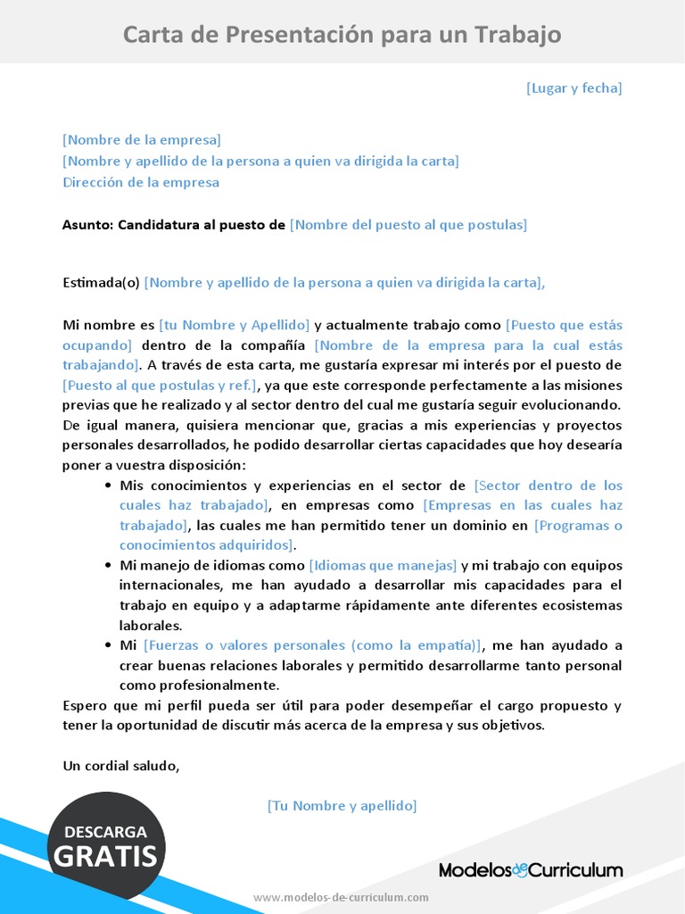 Es importante que incluyas la información de la persona a la que va dirigida la carta así como tu propia información. Nombre y apellido de la persona a quien va dirigida la carta cargo empresarial de la persona a quien va dirigida la carta nombre de la empresa a la cual va dirigida la carta apreciado a título y apellido tenemos el agrado de saludarle en la ocasión de poner a su disposición nuestros servicios. Carta de presentación profesional. En primer lugar si no sabes exactamente a quién te diriges debes poner dear sir or madam.