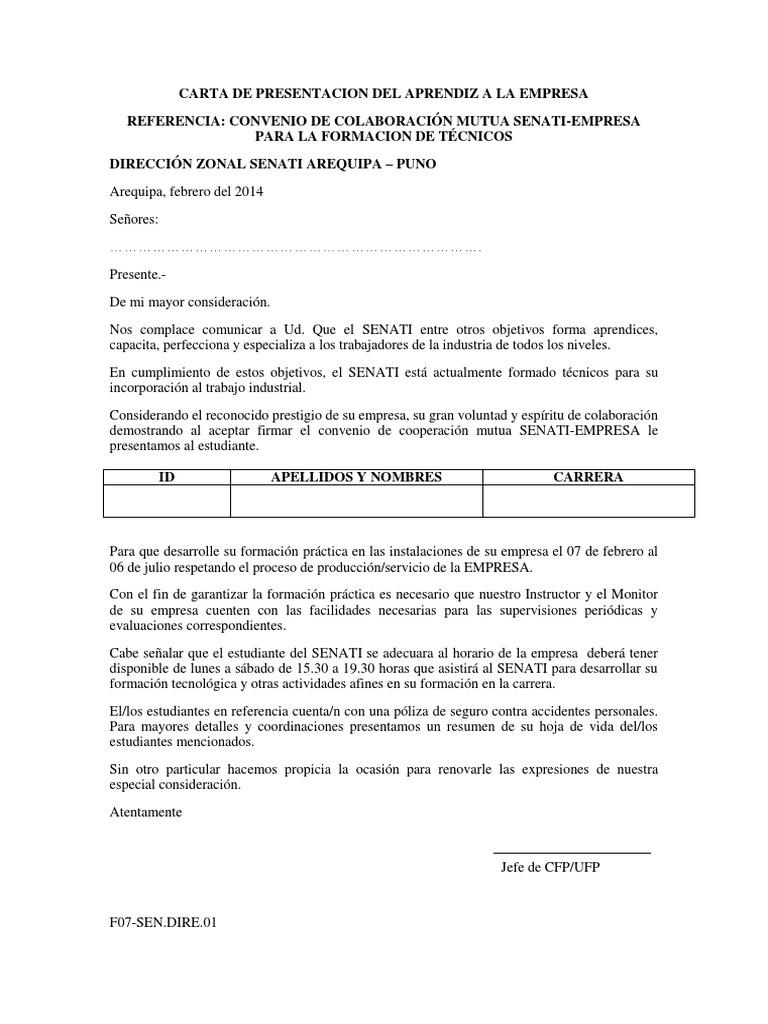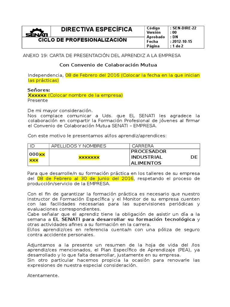 Servicio nacional de adiestramiento en trabajo industrial. Lo ideal es que la carta vaya dirigida a la persona de recursos humanos o el jefe del departamento al que quieres enviar tu documento de esta manera muestras respeto y un genuino interés. Mayor reposo de oliveira mengoa. Modelo de carta de presentacion de senati.