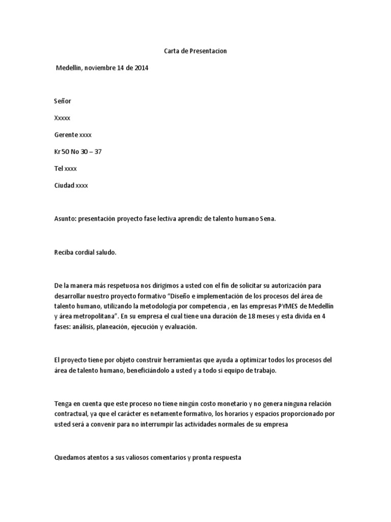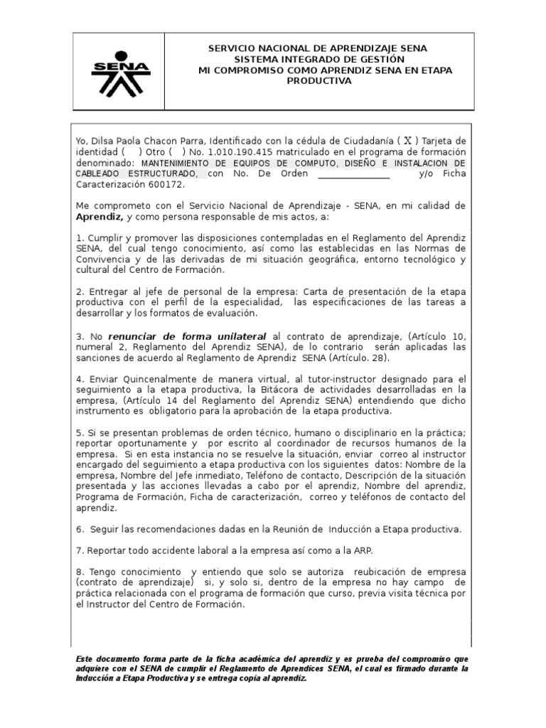 Colombia documentos similares a sena carta de presentación. Sí siempre y cuándo el 51 de los participantes están en modalidad de aprendiz estudiante sena qué haya finalizado la etapa lectiva de un programa de formación titulada dentro de los últimos 24 meses estudiante qué se encuentre cursando los dos 2 últimos semestres o el ochenta por ciento 80 de los créditos académicos de un. Avenida 6 no 32 a 32. Los procesos de formación del sena promueven la responsabilidad de cada aprendiz facilitando su acceso a diversas.