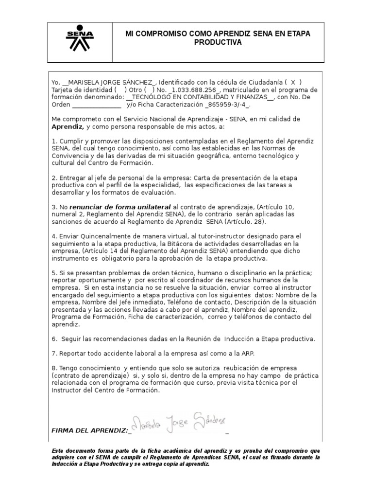 Gerente de recursos humanos y o encargado del proceso de selección aprendices avicola los cambulos s a nit. Estimado director de contratación he tenido noticia de la oferta de su empresa grandes novedades para cubrir una vacante de aprendiz de jefe de turno y me permito escribirle esta carta para ofrecerme como candidato al puesto basándome en mi talento adquirido como vendedor profesional. Participación y cumplimiento el aprendiz sena como gestor principal de su proceso de formación debe participar de manera activa y oportuna en las diferentes actividades de aprendizaje ya sean presenciales o virtuales que conforman la ruta de aprendizaje. En este documento podrás encontrar información sobre los distintas formas de etapa práctica contrato de aprendizaje y el sistema de gestión vir.