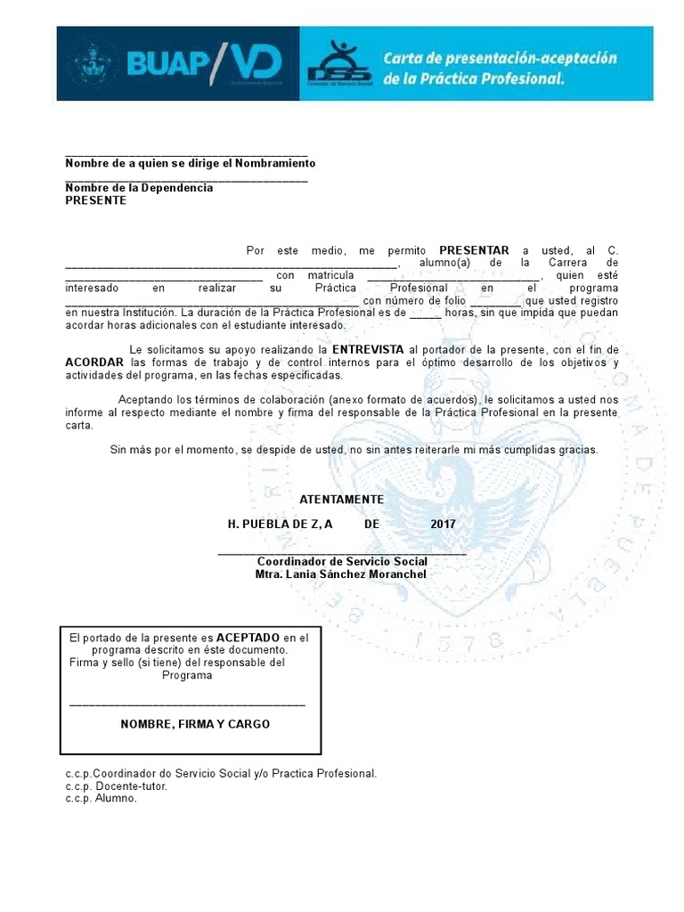 Carta de presentacion buap. 2295500 229 55 00 ext 7407 luz diazsa correo buap mx. 72000 teléfono 52 222 229 55 00. Después de 3 días hábiles cualquier modificación procederá como reposición cubriendo el costo del trámite. Se explicó que de acuerdo con las evidencias que la buap presentó a los especialistas de morton esta carta se extravió en 1996 y formó parte del corpus epistolar que fue consultado y.