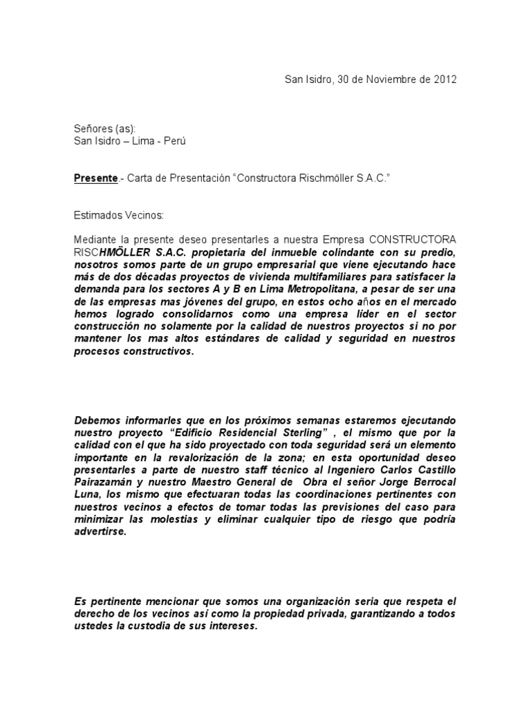 Carta de presentacion constructora pdf. Para finalizar este artículo te presentamos a continuación un modelo de carta de presentación creado por una empresa constructora. Construcciones y reformas hermanos caro s r l chc es una empresa dedicada a la construcción en general disponiendo de técnicos que avalan su profesionalidad. Debe notar que como en toda carta se debe iniciar con un saludo cordial. El primer prrafo debe explicar el motivo de la carta es decir la presentacin de la empresa.