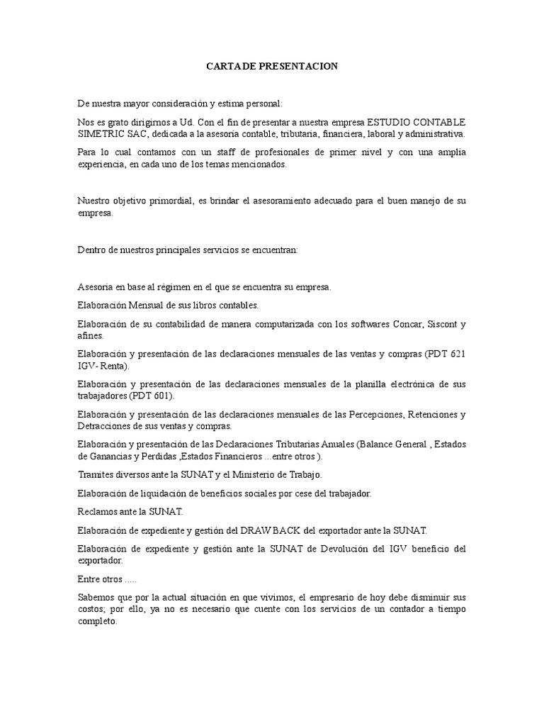 Carta de presentacion de servicios profesionales contables. Redacción carta de presentación de servicios los profesionales o empresas que desean ofrecer sus servicios necesitan publicitarse por diversos medios. Lima noviembre 1 de 2013. Tatianas37 5 de enero de 2014 355 palabras 2 páginas 10 952 visitas. Muchas empresas ofrecen sus servicios a través de facebook o twitter.
