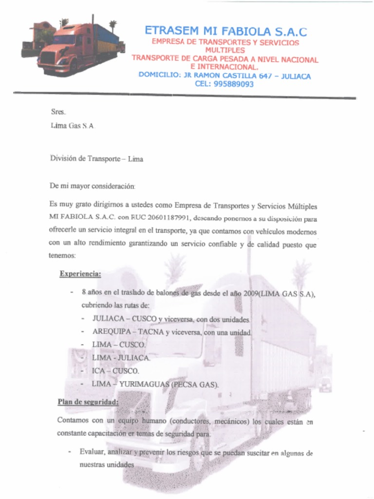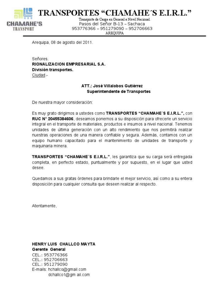 Carta de presentacion de transporte de carga. Almacenes y medios logísticos de optimo rendimiento. Carta presentación la presente tiene como objeto extenderle un fraterno saludo y a la vez hacerle llegar nuestra carta de presentación conocedores de sus procesos y al contar con la infraestructura y la experiencia. Carta de presentación nuestra empresa tiene como actividad principal el transporte de mercancías por carretera nacional e internacional para desarrollar dicha actividad disponemos de una amplia flota preparada con carga de volumen dotados de la última tecnología con una edad media de un año. De nuestra mayor consideración.
