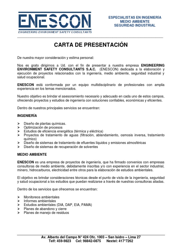 Carta de presentacion de una empresa ambiental. Descargar formato de carta presentacion para empresa el formato de carta de presentación para una empresa es ideal para presentarse ante alguna institución con la cual desees tener una relación profesional o laboral para dar a conocer los servicios que tienen disponibles a sus posibles clientes o proveedores y ya ellos puedan decidir a la hora de elegir. Hay una competencia feroz y debe destacarse. Eche un vistazo a nuestro excelente ejemplo de carta de presentación para agricultura ambiental para que se inspire y pueda obtener el trabajo de sus sueños. Se trata de cartas que emiten las empresas con el fin de darse a conocer y mostrarles a los clientes o posibles clientes los servicios que ofrece y el trabajo al que se dedican.