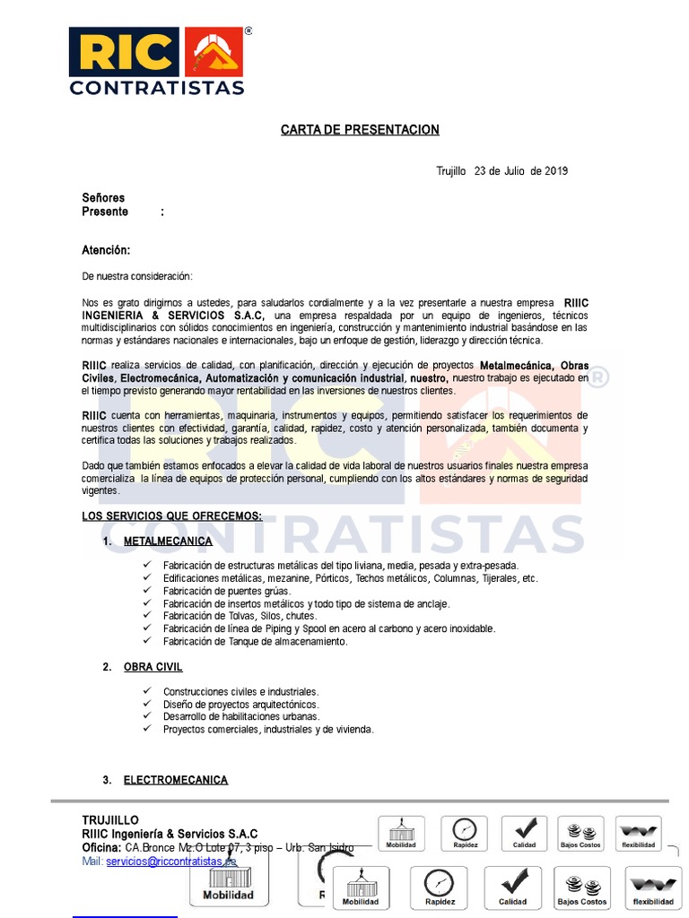 Carta de presentacion de una empresa de limpieza a un particular. La carta de presentación de una empresa es un documento formal que como su nombre lo indica las empresas lo emiten para indicar cuáles son los servicios que tienen disponibles y que así sus posibles clientes conozcan un poco más acerca de ellas muchas veces una compañía las manda como parte de su cv empresarial para que así tenga un toque más profesional en lo que se envía. Después de todo realmente solo tienes una oportunidad de causar una gran impresión. Como pueden ver en el curriculum vitae que les adjunto tengo una experiencia de más de 8 años realizando trabajos de limpieza de los cuales los últimos 3 años han sido. También enfrentaremos a empresas de la competencia y si queremos figurar dentro del mercado.