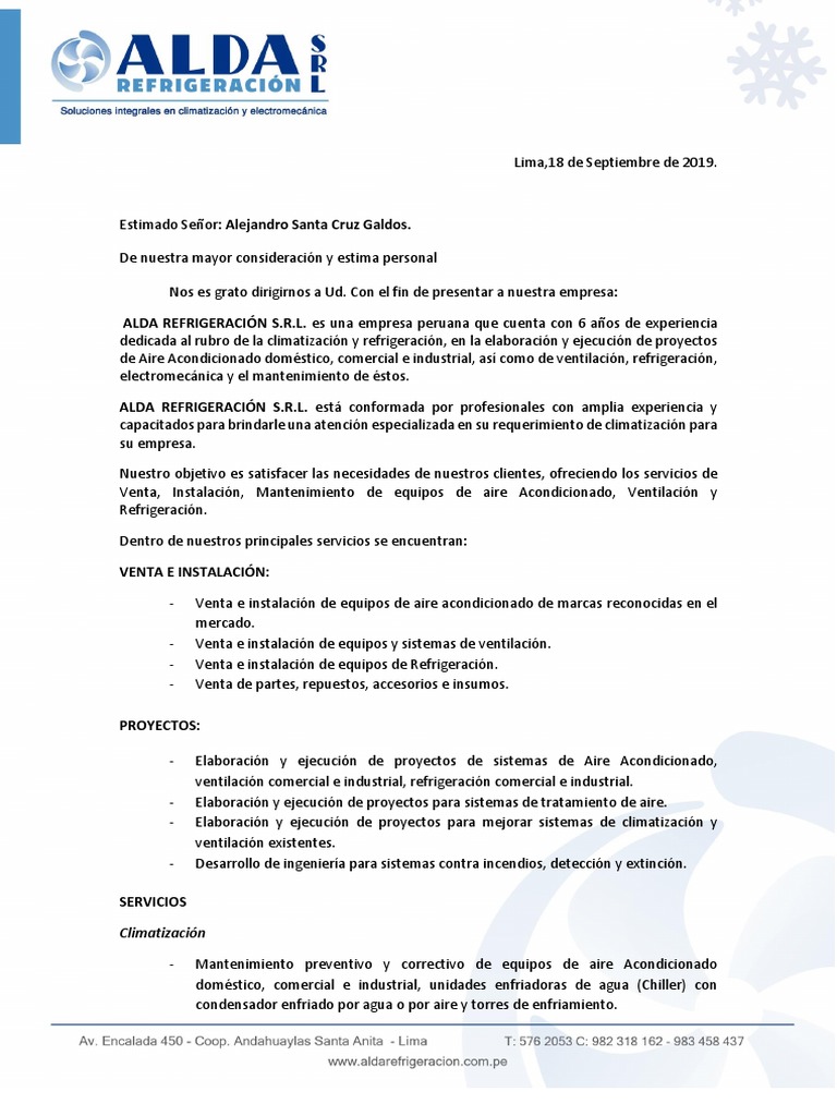 Carta de presentaciã n de una empresa de servicios es de gran utilidad para el empresario que al abrir su empresa necesita promocionar sus servicios o productos. Calificado con experiencia de ms de 15 aos en el mercado del aire acondicionado servicios con la venta e instalacin de equipos de aire acondicionado tipo central y todo lo relacionado con sistemas de ventilacin mecnica. Carta de presentación empresa. Las empresas pueden ofrecer dos tipos de cosas.