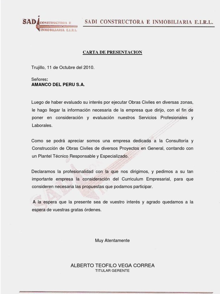 Carta de presentacion de una empresa inmobiliaria. Rivera navarrete 120 lima perú telf. Modelo de carta de entrega modelo de carta de entrega generalmente las cartas de entrega se redactan como consecuencia directa de las cartas de oferta a parte de que también en numerosas situaciones el que comercia industrializa o simplemente el particular se dirige de una forma espontánea mediante una carta por escrito a una empresa o razón social para realizar el formulario de la entrega. La carta de presentación de una empresa es un documento formal que como su nombre lo indica las empresas lo emiten para indicar cuáles son los servicios que tienen disponibles y que así sus posibles clientes conozcan un poco más acerca de ellas muchas veces una compañía las manda como parte de su cv empresarial para que así tenga un toque más profesional en lo que se envía. Por lo tanto necesito que me colaboren con una carta de presentacion para ofrecer mis servicios.