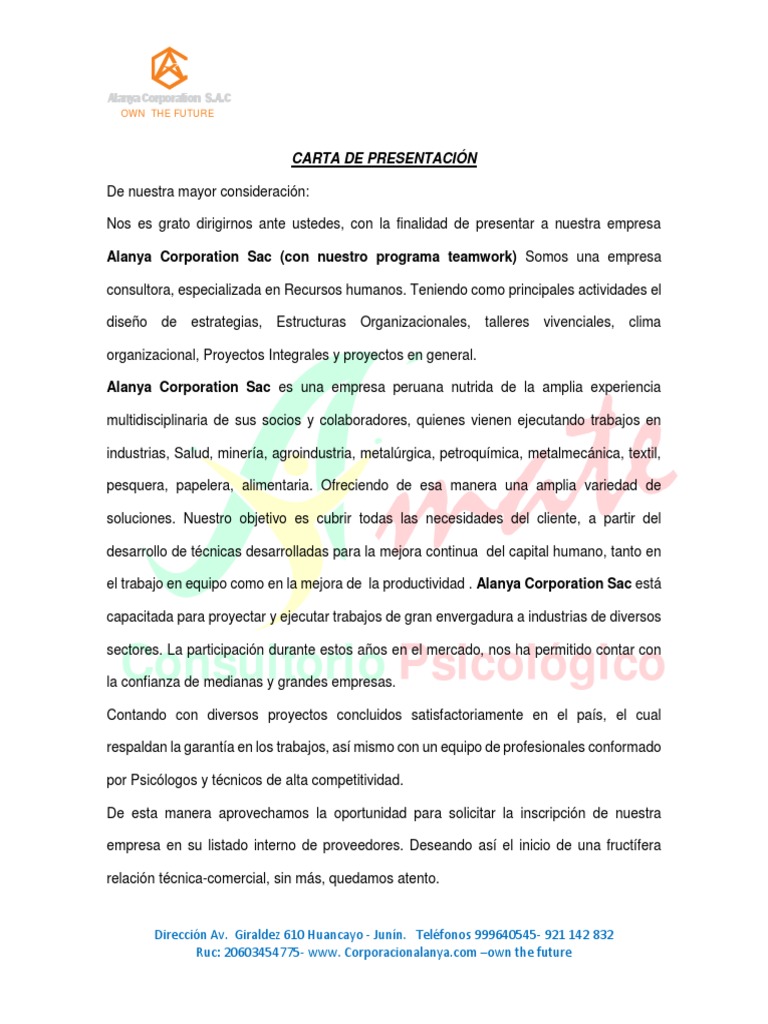 La empresa cuenta en la actualidad con instalaciones propias. Se trata de cartas que emiten las empresas con el fin de darse a conocer y mostrarles a los clientes o posibles clientes los servicios que ofrece y el trabajo al que se dedican. Desde hace años he ejercido como abogado consultor economista para distintas empresas se puede hacer una pequeña relación de las más importantes. Presentacion de la empresa de nuestra mayor consideración y estima personal.