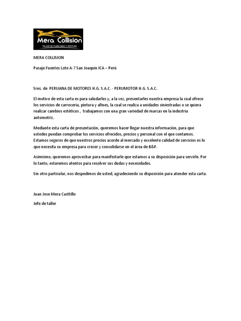 Carta de presentacion taller automotriz. Carta de presentación petición de otorgamiento para afiliación taller. Eléctrico automotriz asimismo servicio de pintura y planchado de vehículos y embarcaciones pesqueras comercialización representación distribución importación de repuestos. Carta de presentación somos un taller enfocado en la mecánicaexpress. Automotriz jcd es una micro empresa con mas de 20 años de experiencia que esta enfocada en solucionar el o los rechazos que le encuentran en la revisión técnica.