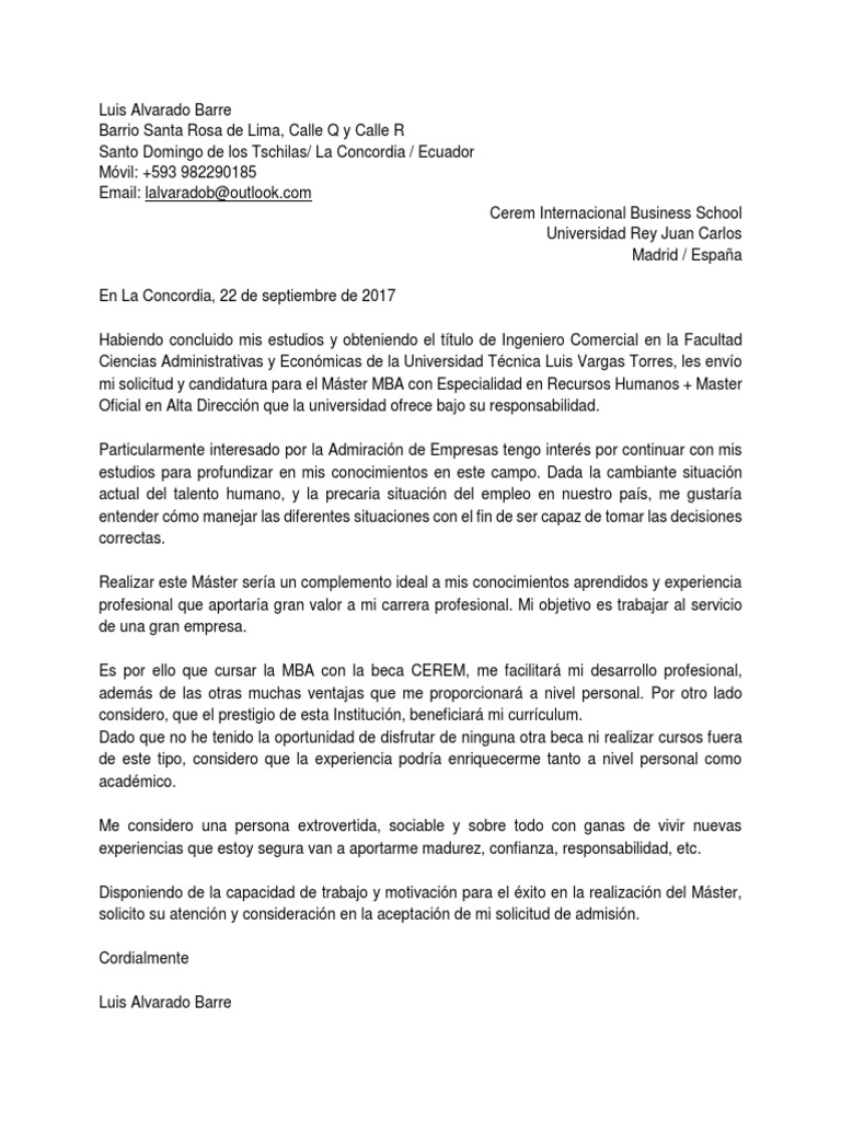 Las cartas de motivación de máster son un documento que se pide en algunas universidades y escuelas de negocios en las que el. Carta de motivación máster. En este espacio es donde entraría la carta de motivación el máster en este tipo de cartas se busca convencer a algún director o encargado de la universidad en la que se aspire hacer la maestría o para obtener una beca cualquier fin que esté dirigido a lo académico puede ser descrito aquí. Usa el formato adecuado para tu carta de motivación.