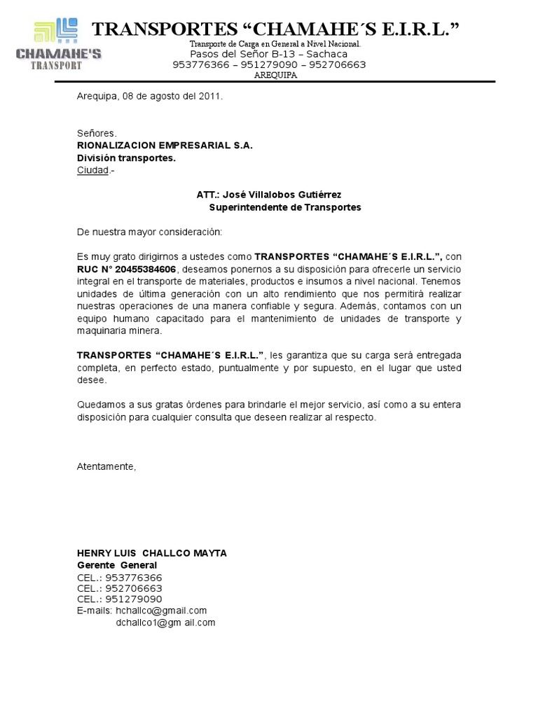 Carta presentacion empresa transporte carga. Presentación transportes adamo s a. Nombre y razón social de la empresa que recibe la carta presente reciban un saludo cordial de parte de nombre y razón social de la empresa que se presenta empresa que nace con la intención de revolucionar el ramo de ramo comercial al cual pertenece la empresa que se presenta mediante la incorporación de recursos humanos y. Logo de la empresa que se presenta lugar y fecha sres. Una carta de presentación de servicios es una carta enfocada a informar a los clientes potenciales las capacidades que tiene una empresa para prestar los servicios correspondientes a su giro.