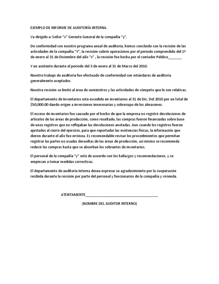 Ejemplo de carta de presentacion de auditoria interna. Carta de presentación en una auditoría se expide para hacer saber que la empresa o el negocio va a sufrir en un futuro una auditoría y solicita de este modo que la persona gerente o encargada de la visita tenga todo listo y preparado para tal evento. En resumen un informe de auditoría contiene información relevante para accionistas empleados e instituciones financieras respecto a la situación económica de una empresa. Una discusión de plan de auditoria interna iso 9001 ejemplo podemos compartir. La empresa textil del valle s a.