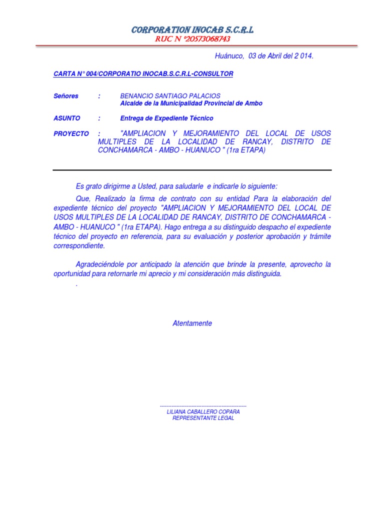 Modelo de carta de presentacion para municipalidades. Para muchos crear una carta de presentación cuando no se tiene experiencia laboral puede ser una tarea difícil. En todo caso si realizamos una solicitud siempre debería existir una respuesta que debido al tema comentado no es más que los pormenores del precio de cada cosa indicada en el documento previo de pedido sin omitir ningún detalle es más en ciertas oportunidades cabe mencionar otros. En este documento podemos incluir información personal y relevante que puede servir para qué la empresa o empresario se decante a nuestro favor y seleccione nuestra candidatura para una posible entrevista orientada a conseguir el puesto laboral. Huaraz 17 de enero del 2011.